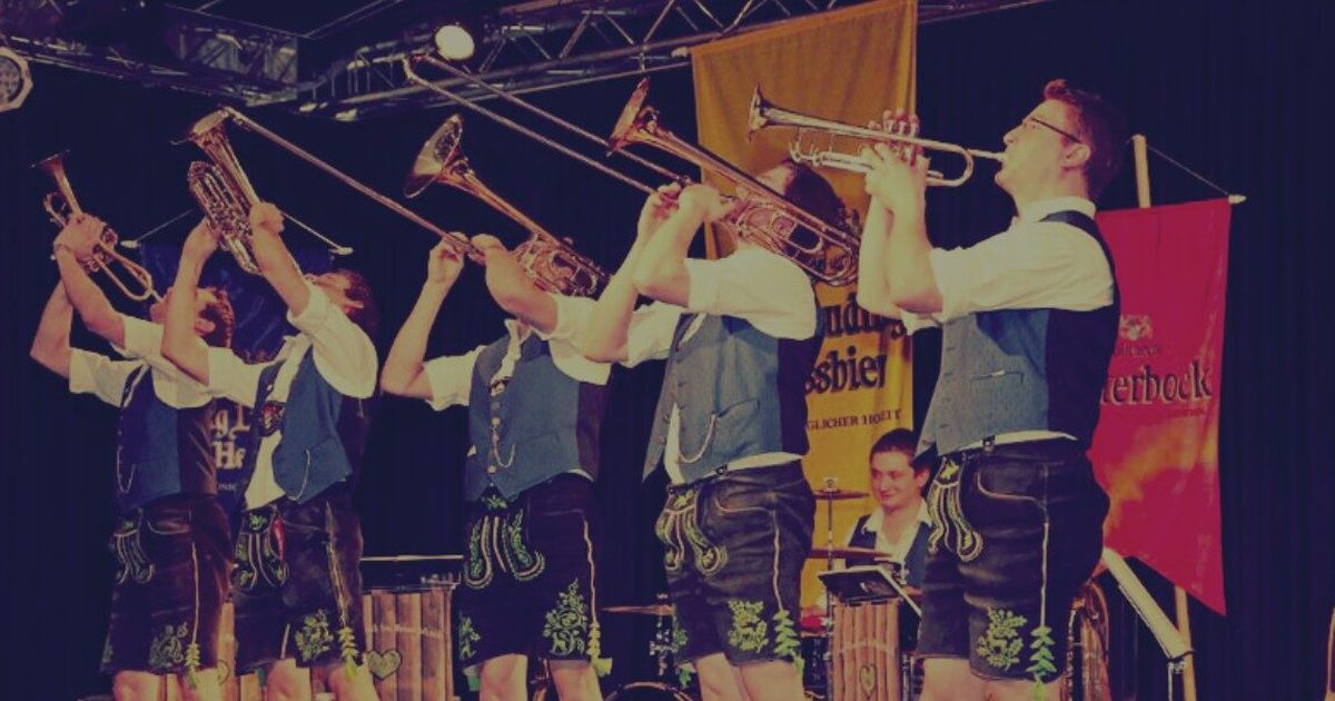 Tromposaund – der Name deutet es schon an. Bei Euch gibt’s Trompeten zu hören! Mit 6 Musikern habt Ihr für eine reine Blasmusik aber eine relative kleine Besetzung. 5 Blechbläser plus Schlagzeug. Erzähl uns doch bitte etwas zum musikalischen Konzept? Unser musikalisches Konzept steht eigentlich schon in unserem Motto. “Von Blasmusik bis Brassmusik.” Idee ist es mit sechs Mann die Musik von großen Kapellen auf das wesentliche zu reduzieren und dabei trotzdem einen fetten Sound wider zu geben. Wichtig ist uns den Spagat zwischen traditioneller Blasmusik und moderner Musik zu schaffen. Unser Slogan, “griabig schmissig lässig”, umschreibt dabei am besten den Effekt den wir bei unserem Publikum erreichen wollen. Musiker traditionell in Lederhosen und Blasinstrumenten spielen alles von Ernst Mosch über W.A. Mozart bis hin zu Toto.